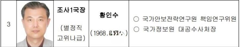 황인수 조사국장은 1968년 태어났고 국가안보전략연구원 책임연구위원으로 활동한 이력을 가지고 있습니다. 그는 국가정보원 대공수사처장을 활동했고 현재 조사국장으로 활동하고 있습니다.